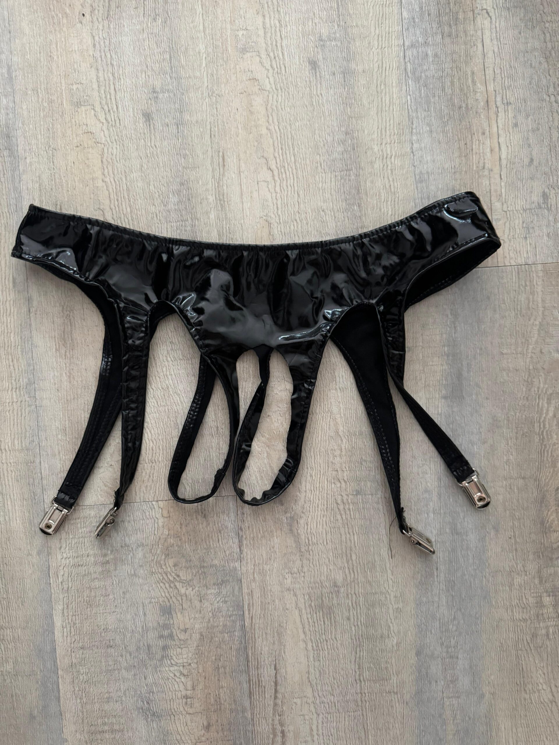 Dieses sündige Straphöschen aus schwarzem, glänzendem Lack wurde nicht nur getragen – es wurde erlebt. Es schmiegt sich hauteng um die Hüften, während der offen gestaltete Schrittbereich einen ungehinderten Blick verspricht und zu verführerischen Spielchen einlädt.